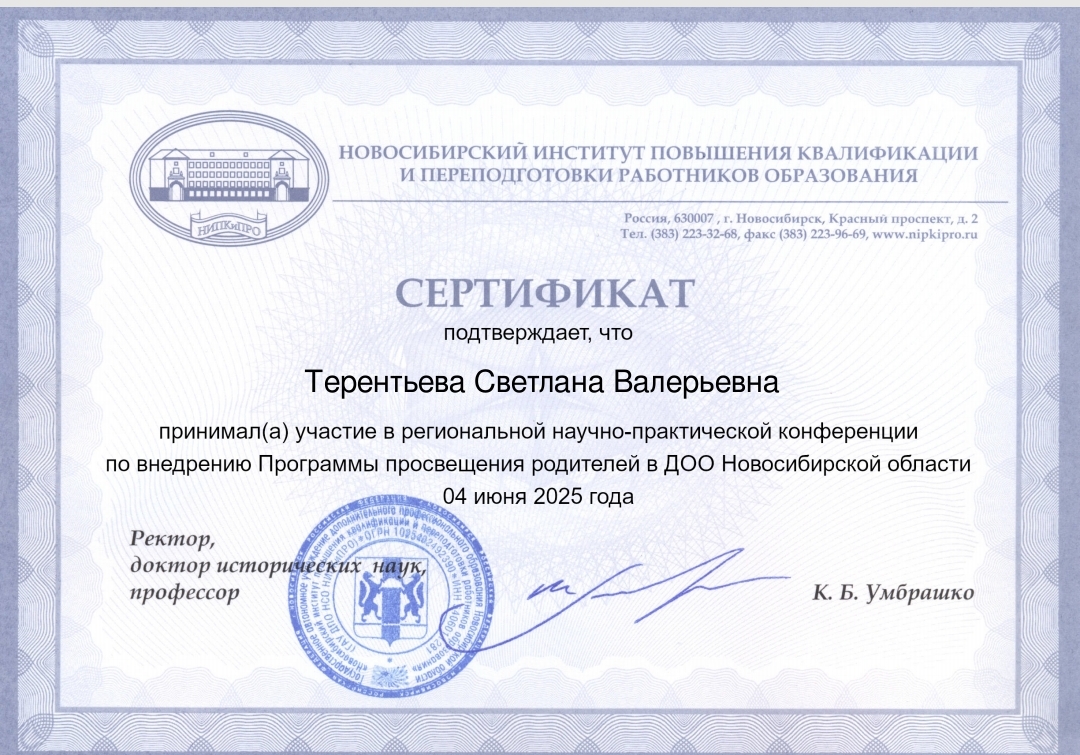 Сертификат участия в региональной научно-практической конференции по внедрению программы просвещения родителей в ДОО новосибирской области